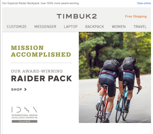 Email promoting Timbuk2’s Raider Pack, winner of a 2014 International Design Excellence Award: Boosted sales of the pack by 500% over the following week